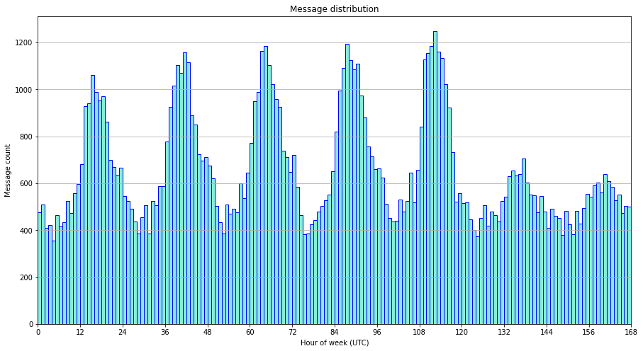 Messages counted by the hour of the week they are received, starting from monday. 110000 messages in total.
